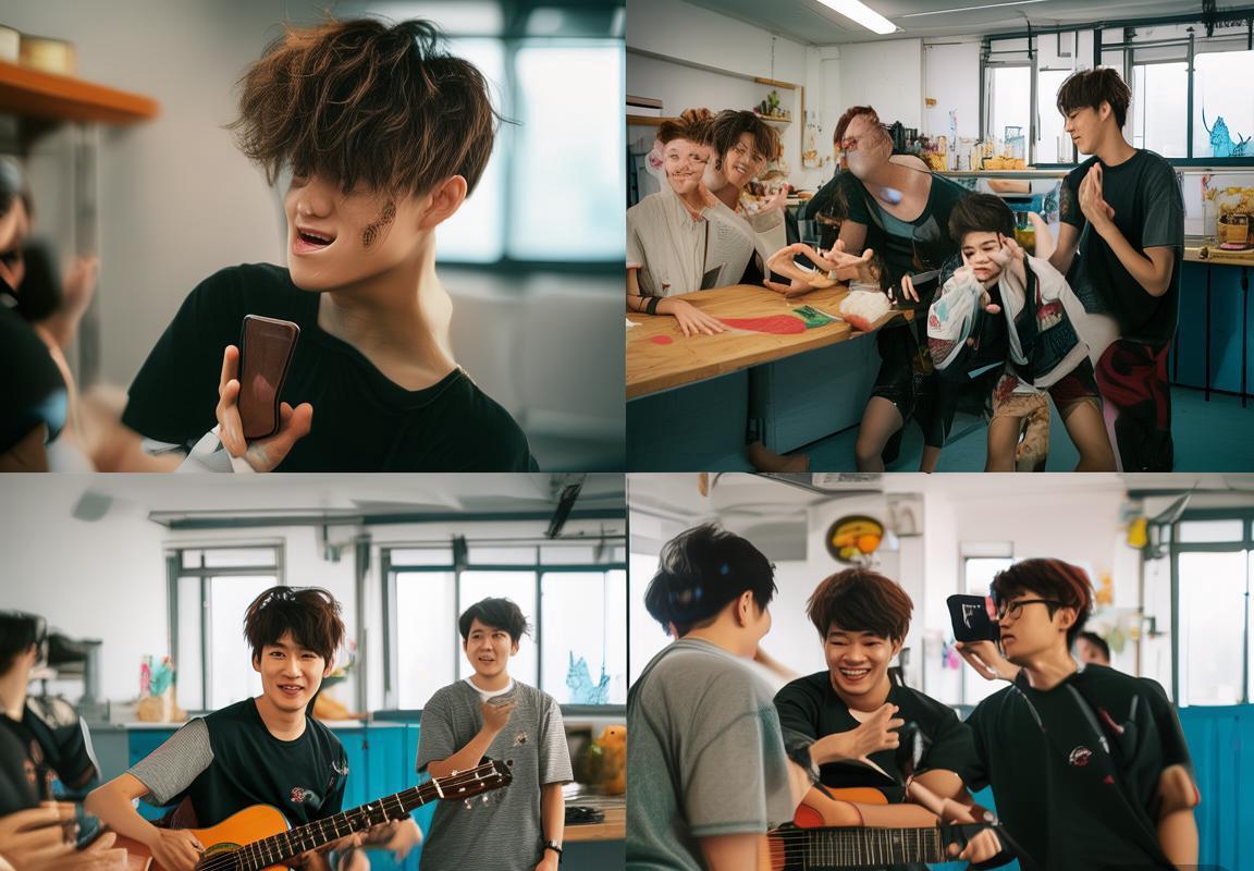 队员们围坐在地板上玩”你画我猜”,TheShy画了个歪歪扭扭的猫咪引发全场爆笑。Rookie偷偷把Ning的手机藏进零食袋,被发现后两人在镜头前追打嬉闹。Wink举着自拍杆挨个采访,轮到Lucas时对方突然对着镜头比心,引得现场工作人员集体起哄。拍摄间隙Xun抱着吉他即兴弹唱,其他队员跟着节奏摇摆哼唱,训练室里充满快活气息。